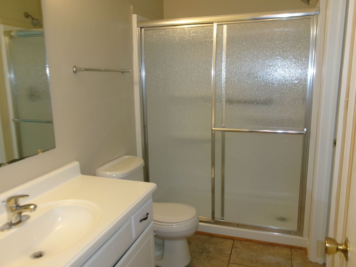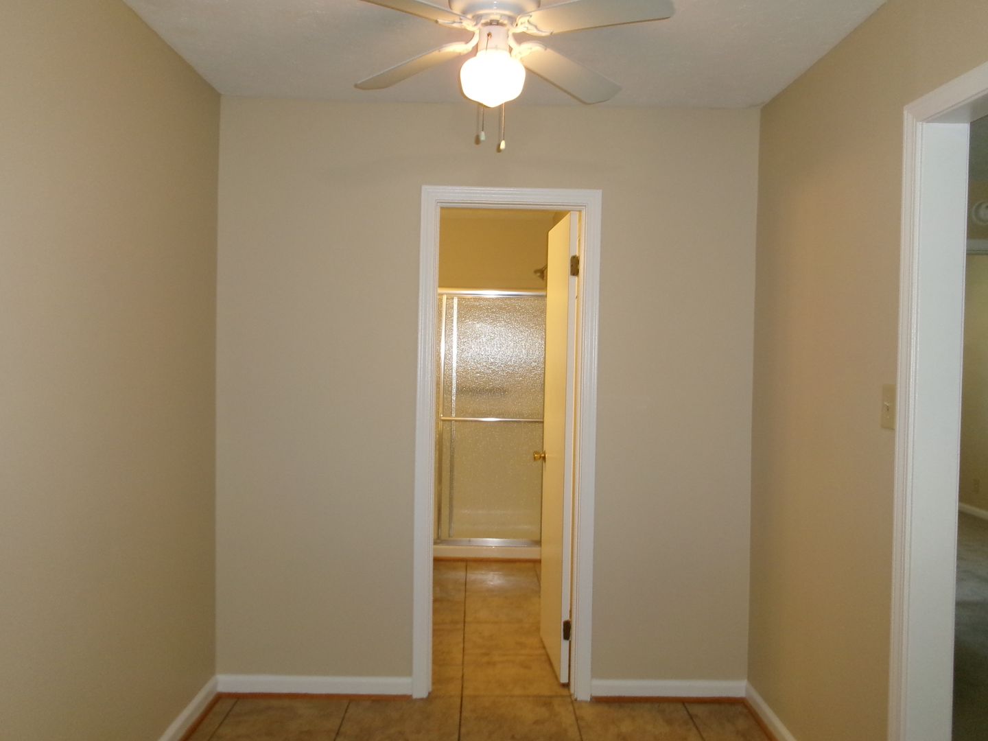 Bathroom has walk- in shower and large linen closet.