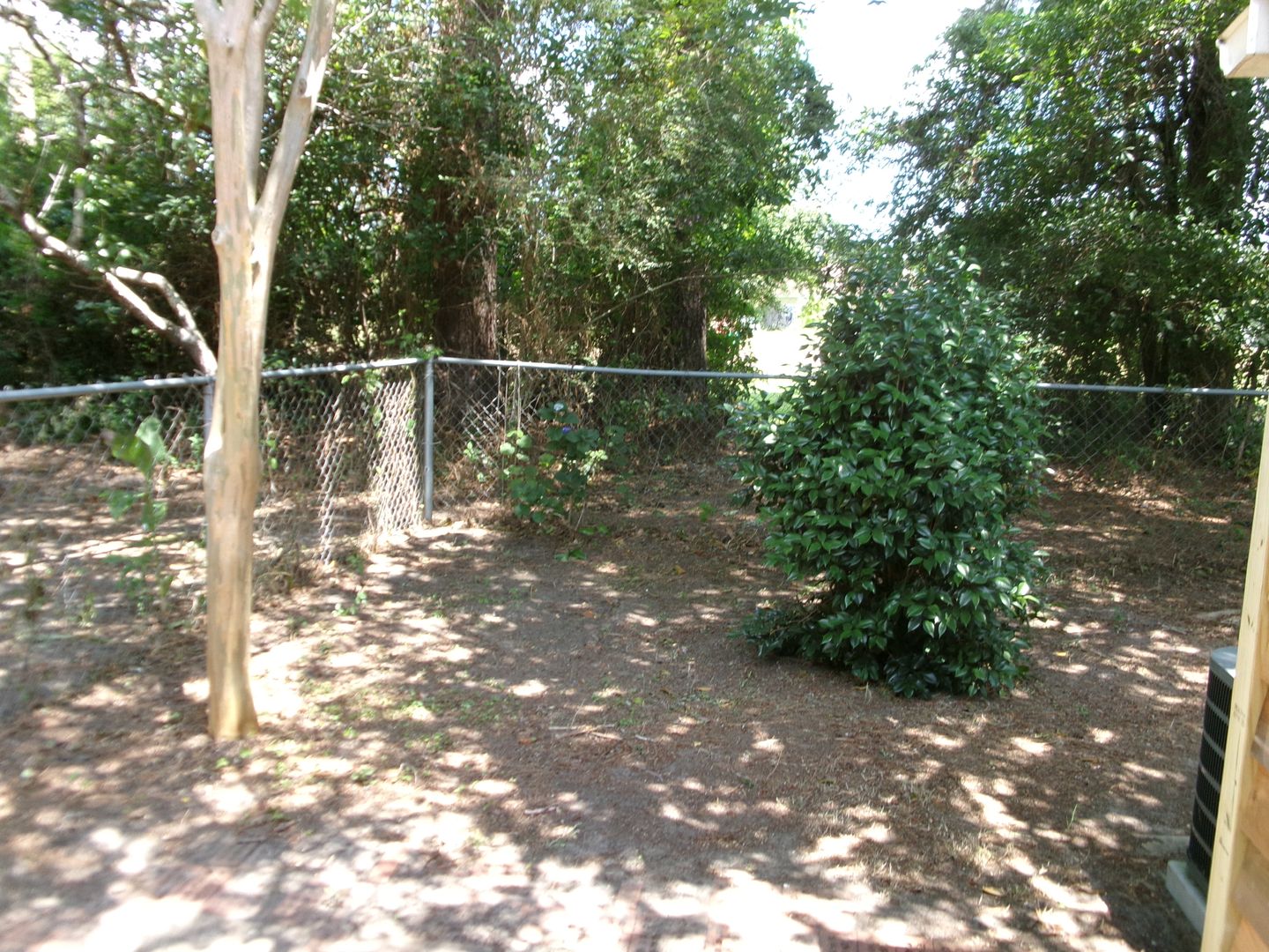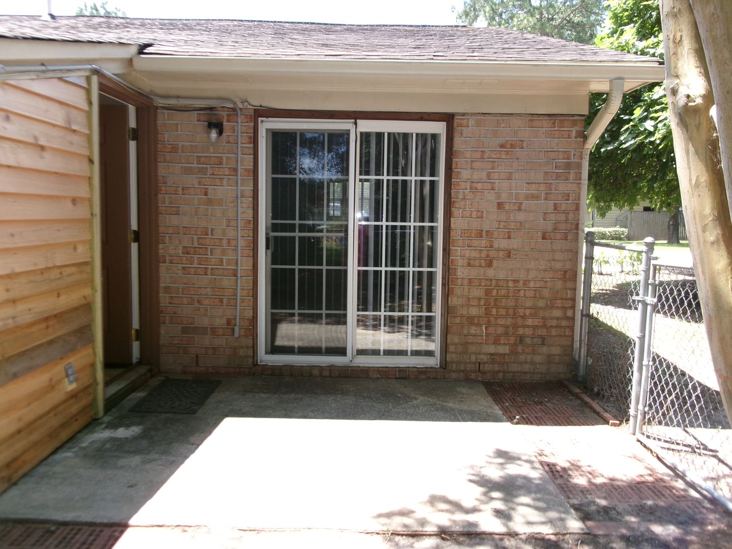 Separate patio and fenced yard area of duplex building.